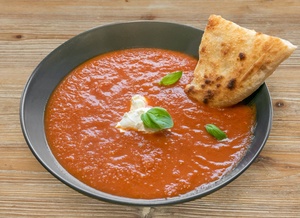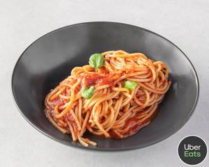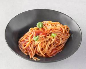 Makaron w sosie pomidorowym z dodatkiem czosnku, cebuli i świeżej bazyli.