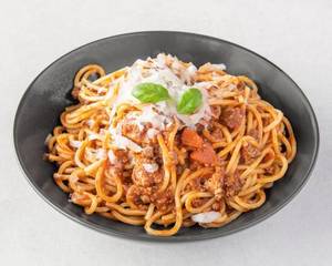 Spaghetti w sosie bolońskim z mięsem wieprzowo-wołowym.
