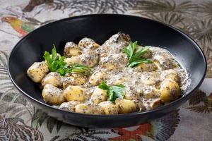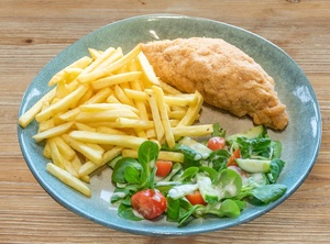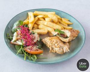 nadziewana szpinakiem, serem, suszonymi pomidorami, podawana z frytkami i sałatką.