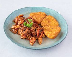 Pieczarki, cebula, papryka, kurczak, sos pomidorowy.