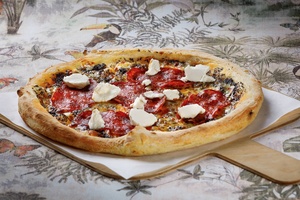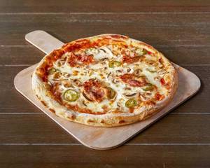 Sos pomidorowy, Mozzarella, pieczarki, Pancetta, cebulka Cipolini, jalapeno. Rozmiar do wyboru.