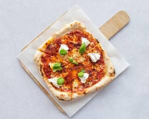 Biały sos, mozarella, salami, cipolini, pomidorki koktajlowe, bazylia