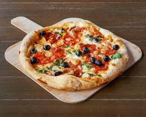 Sos pomidorowy, Mozzarella, szpinak, oliwki czarne, cebulka Cipolini, czosnek, salami Spianata. Rozmiar do wyboru.